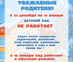 С понедельника по пятницу, группы функционируют в режиме полного рабочего дня (12-часовое пребывание детей)