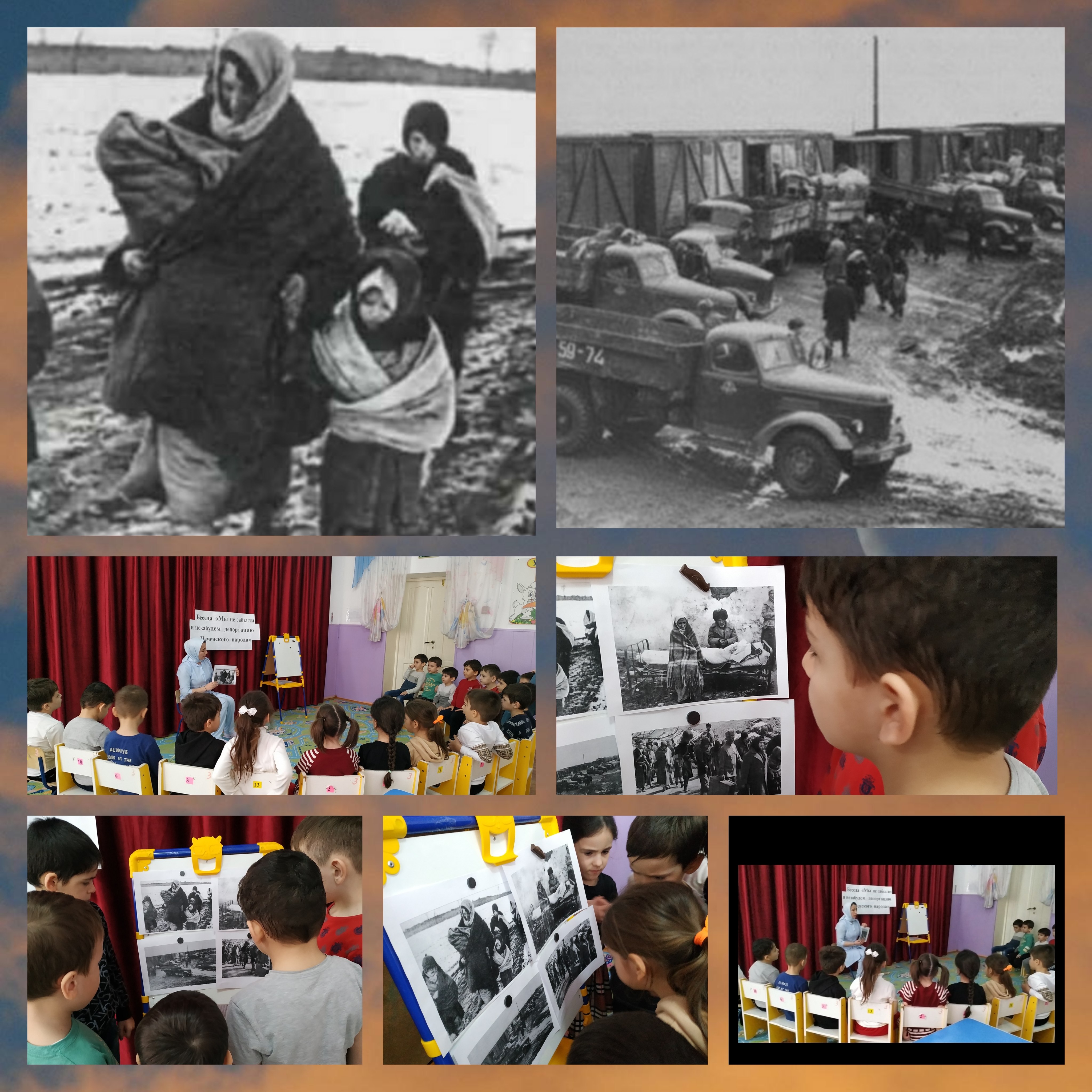 В истории чеченцев есть дни, которые заставляют плакать сердце при каждом слове про 23 февраля 1944 года. Виною этому есть депортация Чеченского народа. В 22 февраля с детьми старшей группы "Звёздочки" была проведена беседа "Мы не забыли и не забудем депортацию Чеченского народа" С целью проведения беседы было научить сопереживать, воспитывать граджанско-патриотические качества, гордости за свой народ.