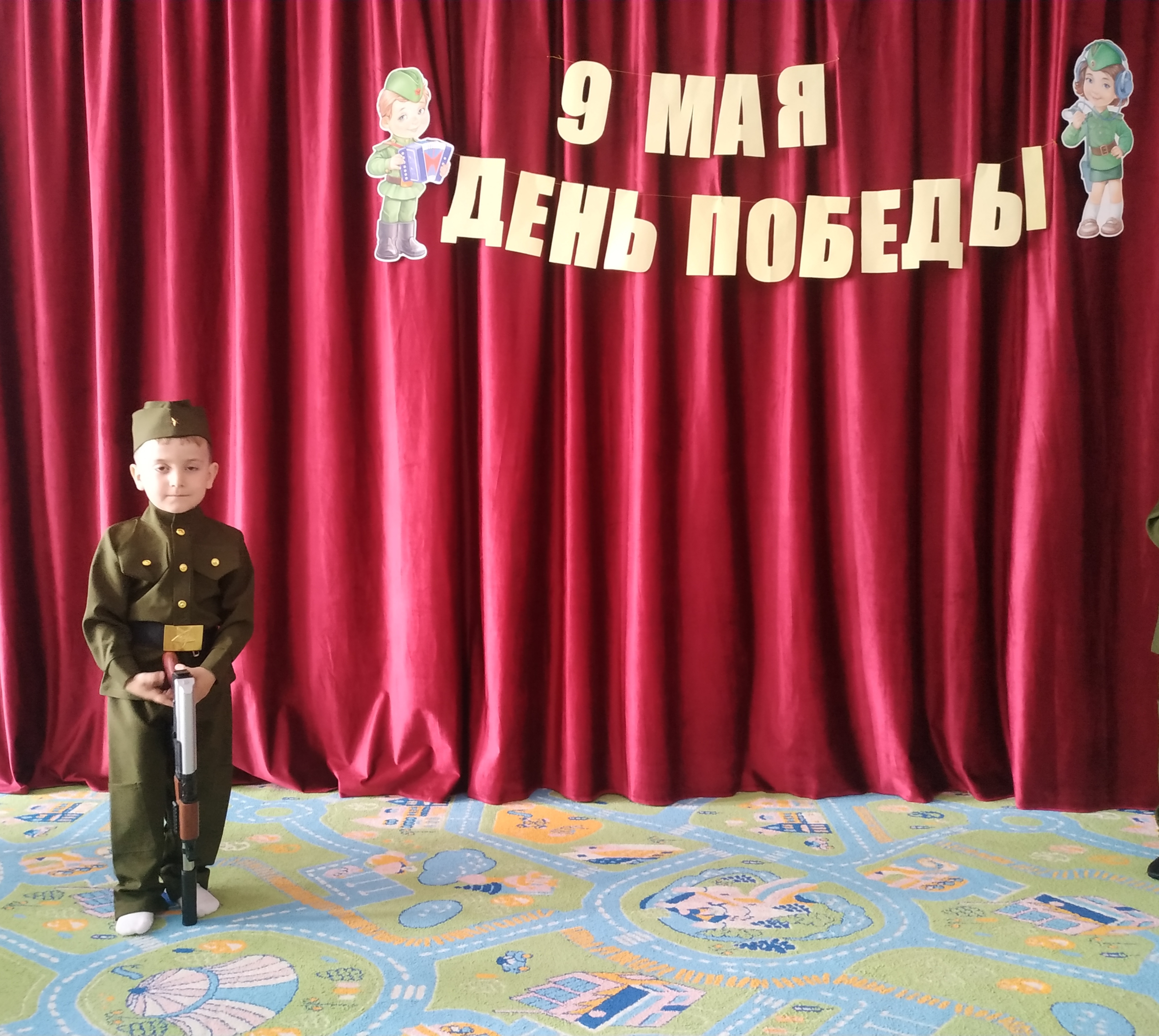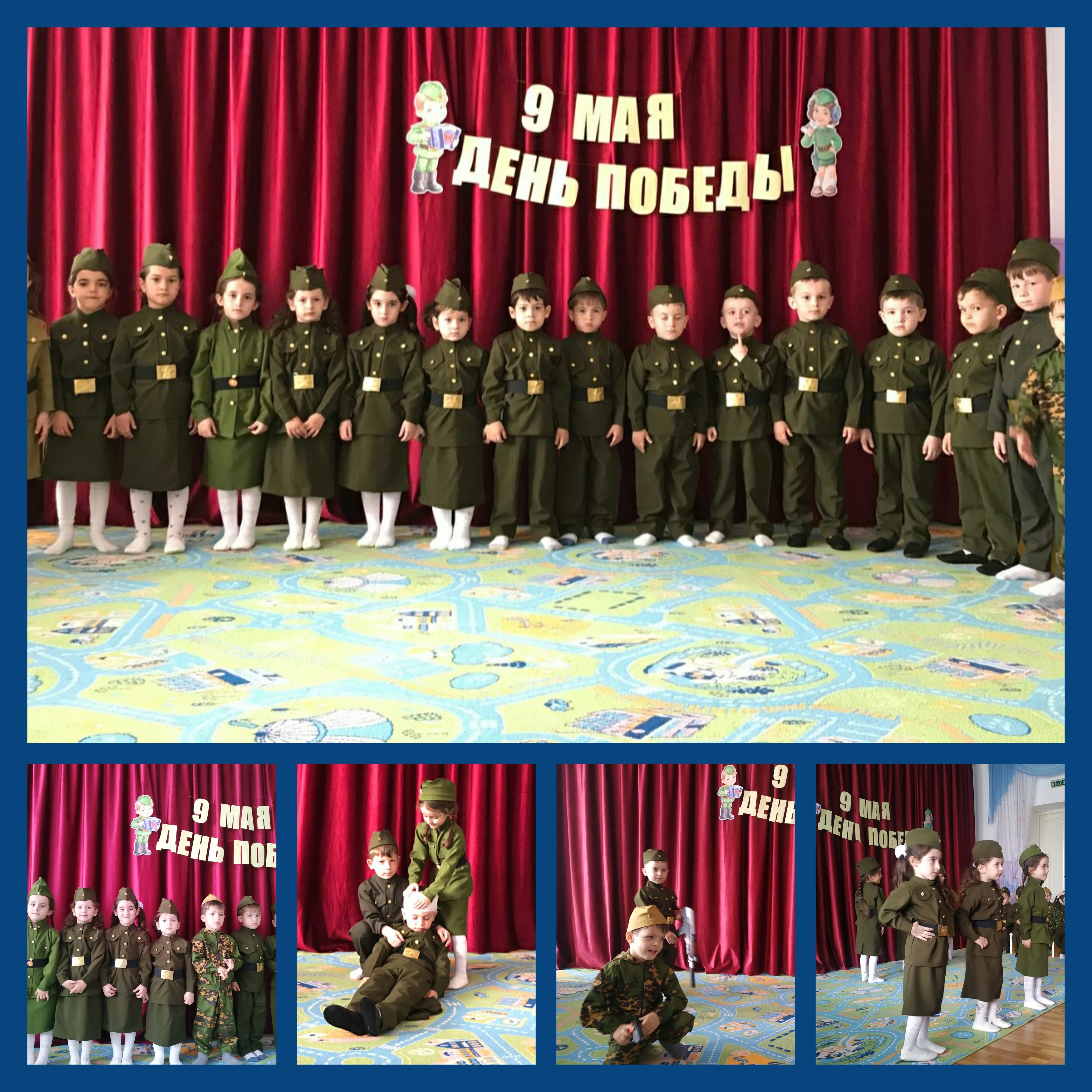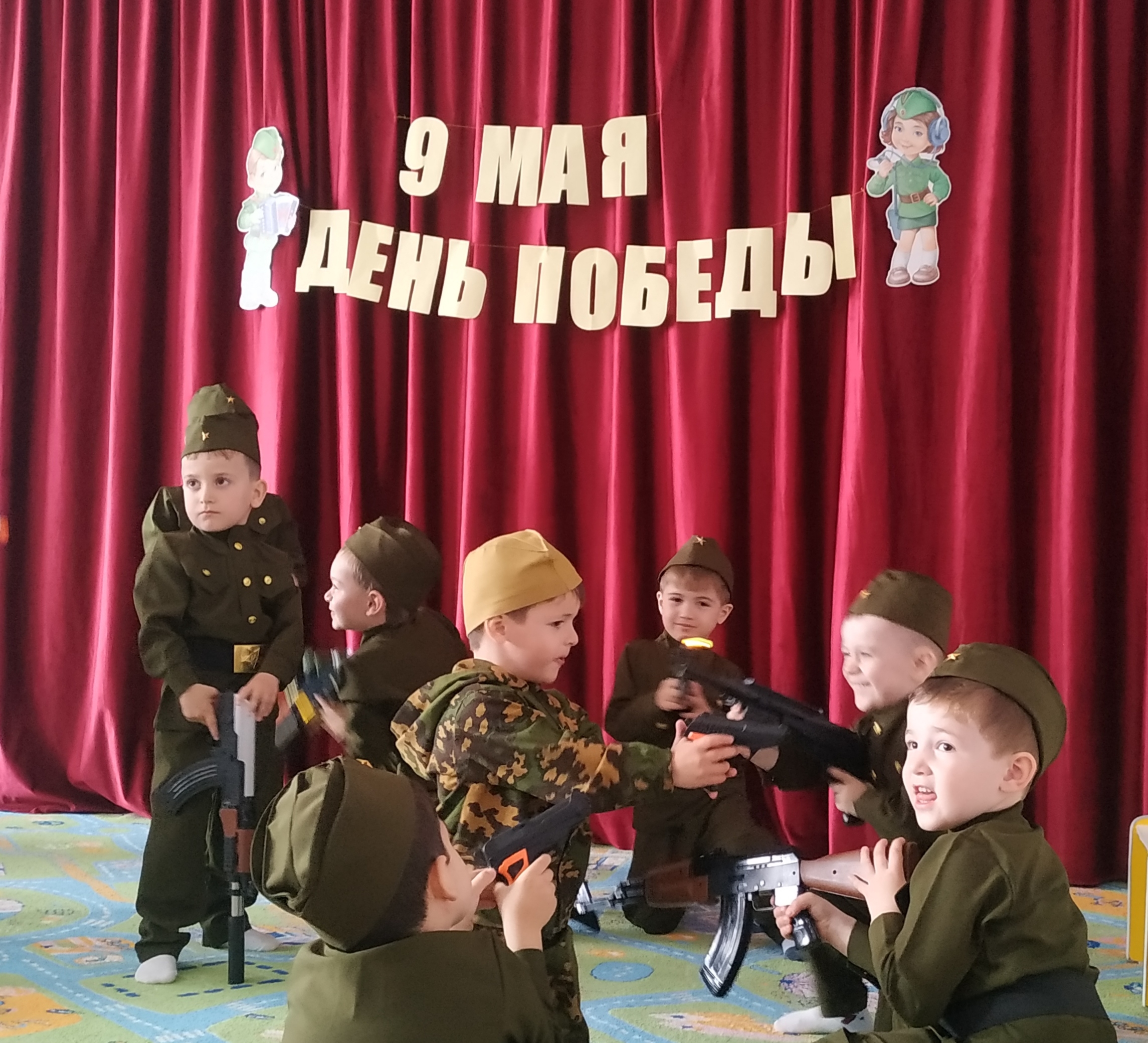 В нашем детском саду состоялось мероприятие, посвященное празднованию Дня Победы. Предварительно с детьми в группах были проведены беседы о подвигах советских людей. Дети показали танец, провели игру "Кто самый сильный", пели песню "Катюша". Показали инсценировку битвы на поле.