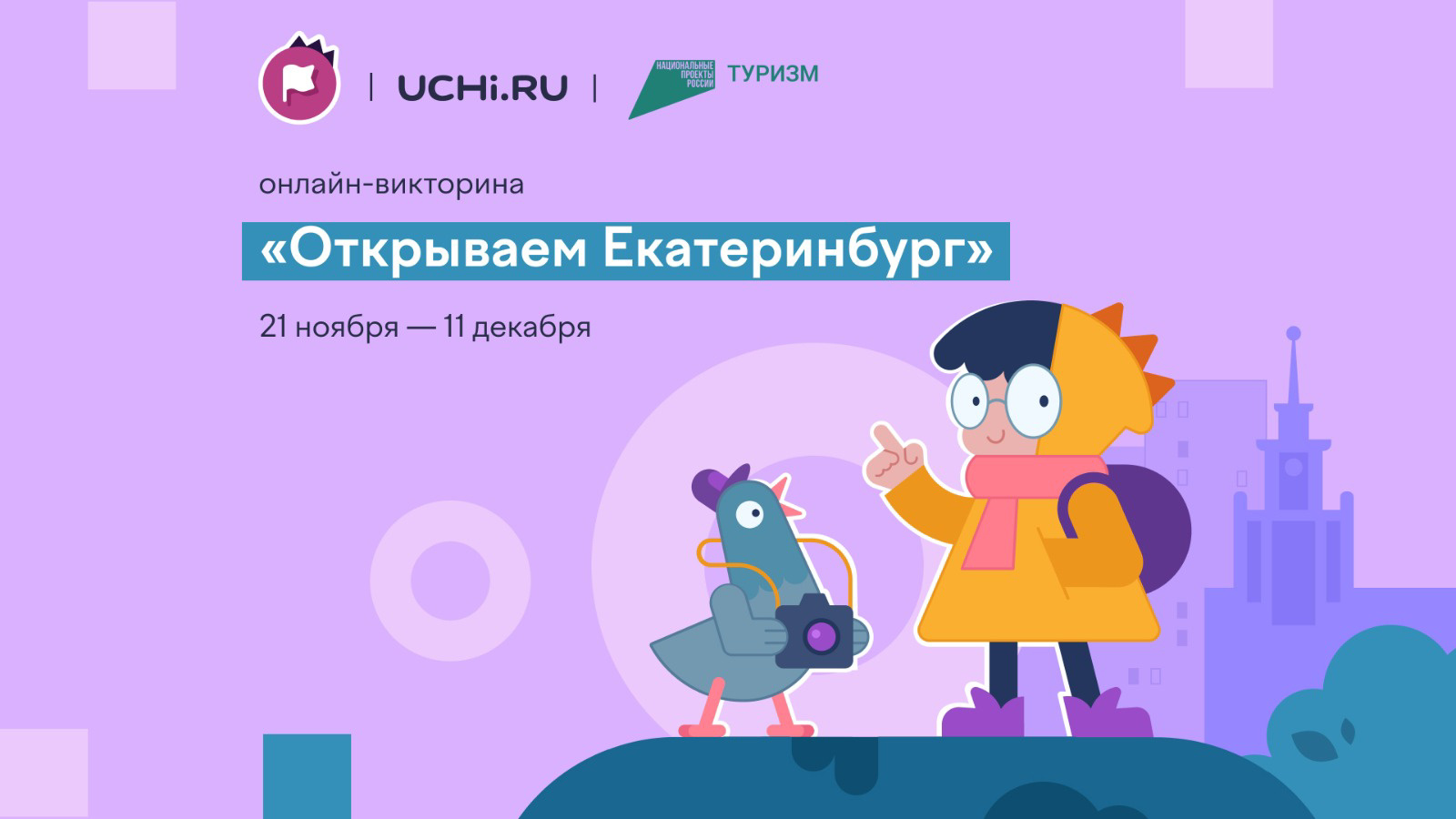 С 21 ноября по 11 декабря 2023 года на образовательной платформе Учи.ру проходит всероссийская онлайн-викторина «Открываем Екатеринбург» для учеников 1–9 классов. Викторина реализована при поддержке национального проекта «Туризм и индустрия гостеприимства», Министерства образования и молодёжной политики Свердловской области, Министерства культуры Свердловской области, Администрации города Екатеринбурга, Департамента образования Администрации города Екатеринбурга, Управления культуры города Екатеринбурга совместно с Музеем истории Екатеринбурга. К онлайн-викторине можно присоединиться на сайте платформы Учи.ру. Ученики, прошедшие викторину, получат дипломы, грамоты или сертификаты. Награды будут доступны в личных кабинетах на следующий день после завершения соревнования.