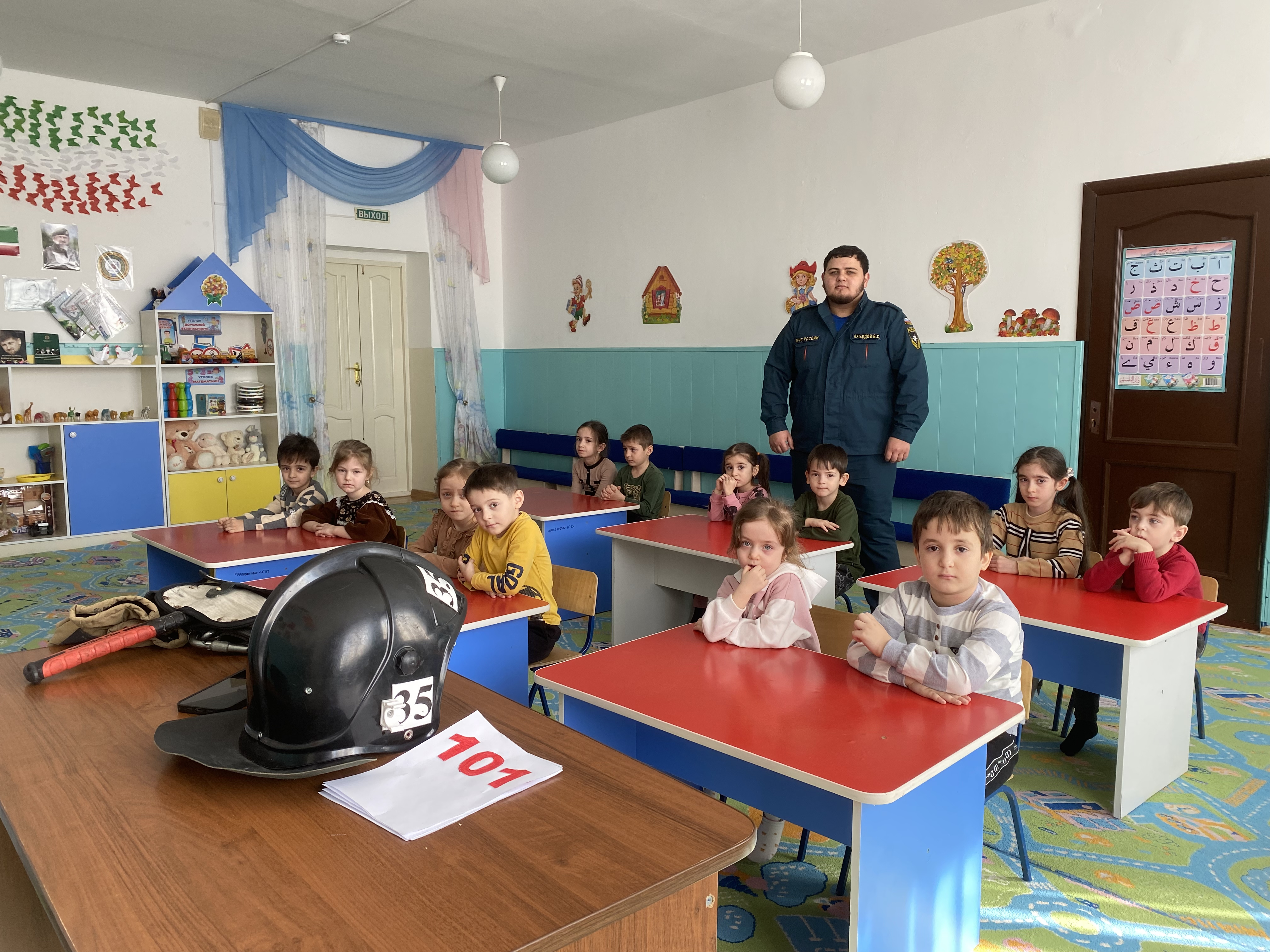 К безопасному образу жизни ребёнка нужно приучать с детства. Поэтому занятия с детьми спасатели и пожарные начинают проводить уже в детском саду. В гости к ребятам пришёл сотрудник МЧС, сержант Ахъядов Бислан Сулейманович.
